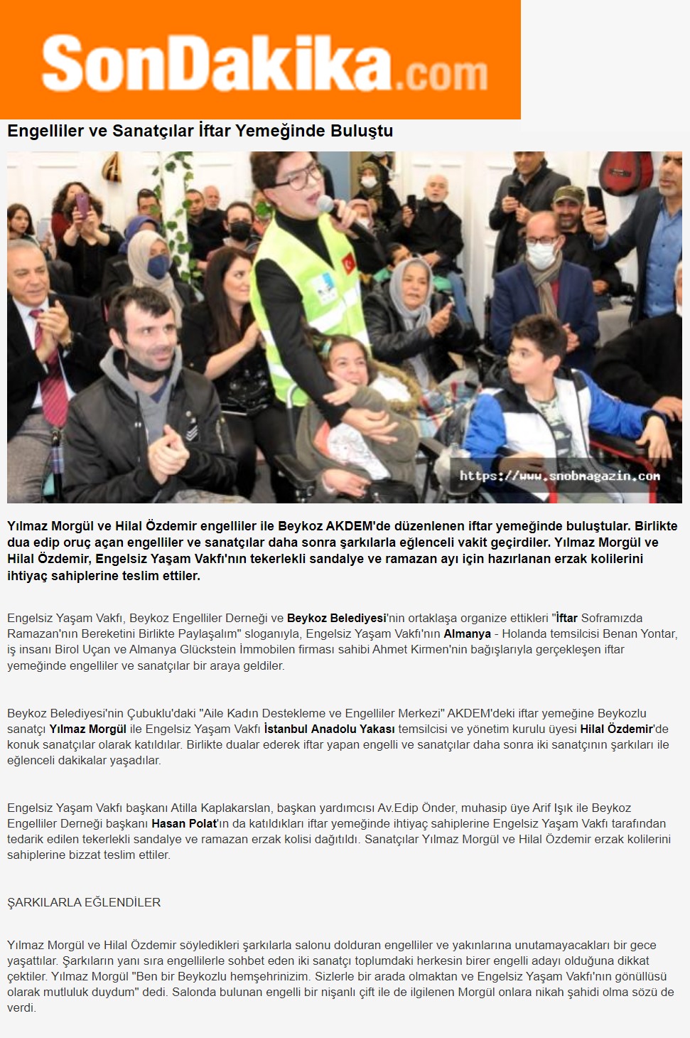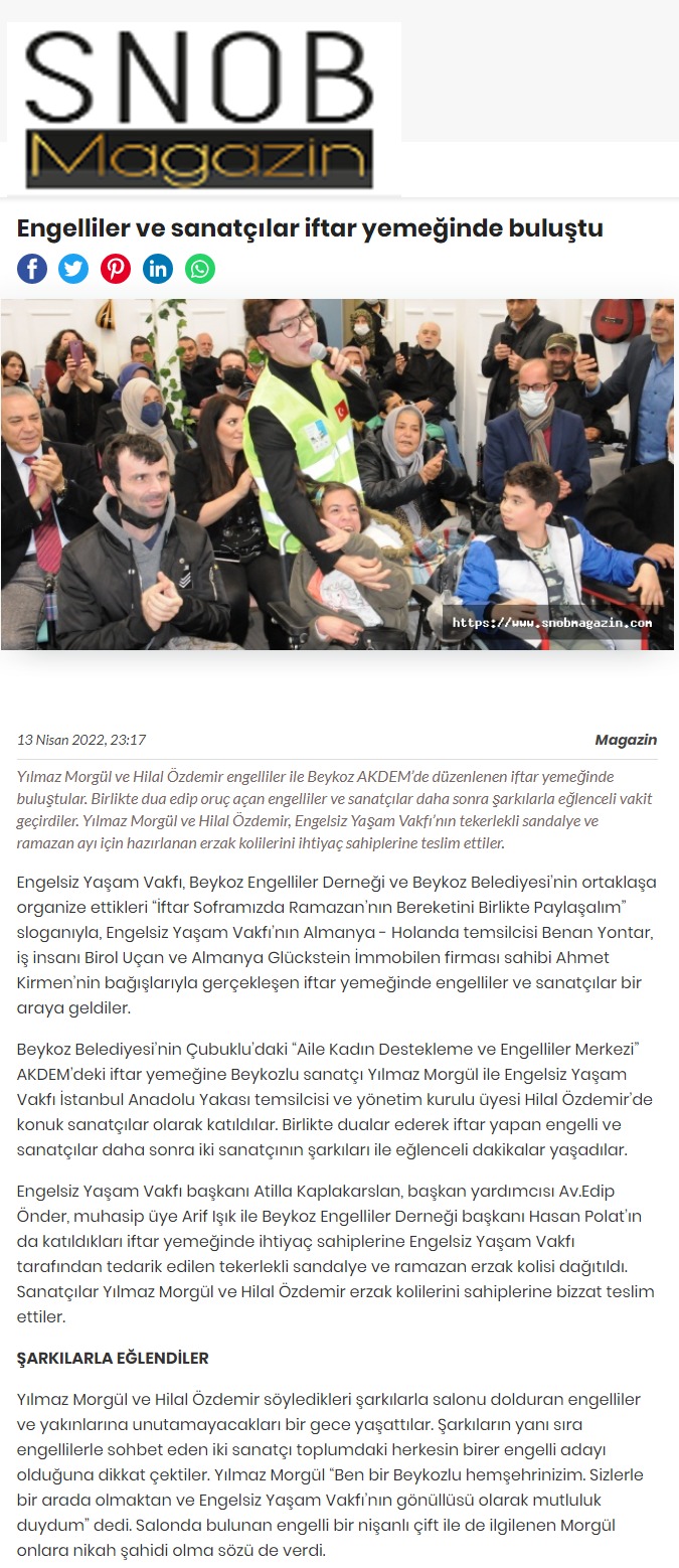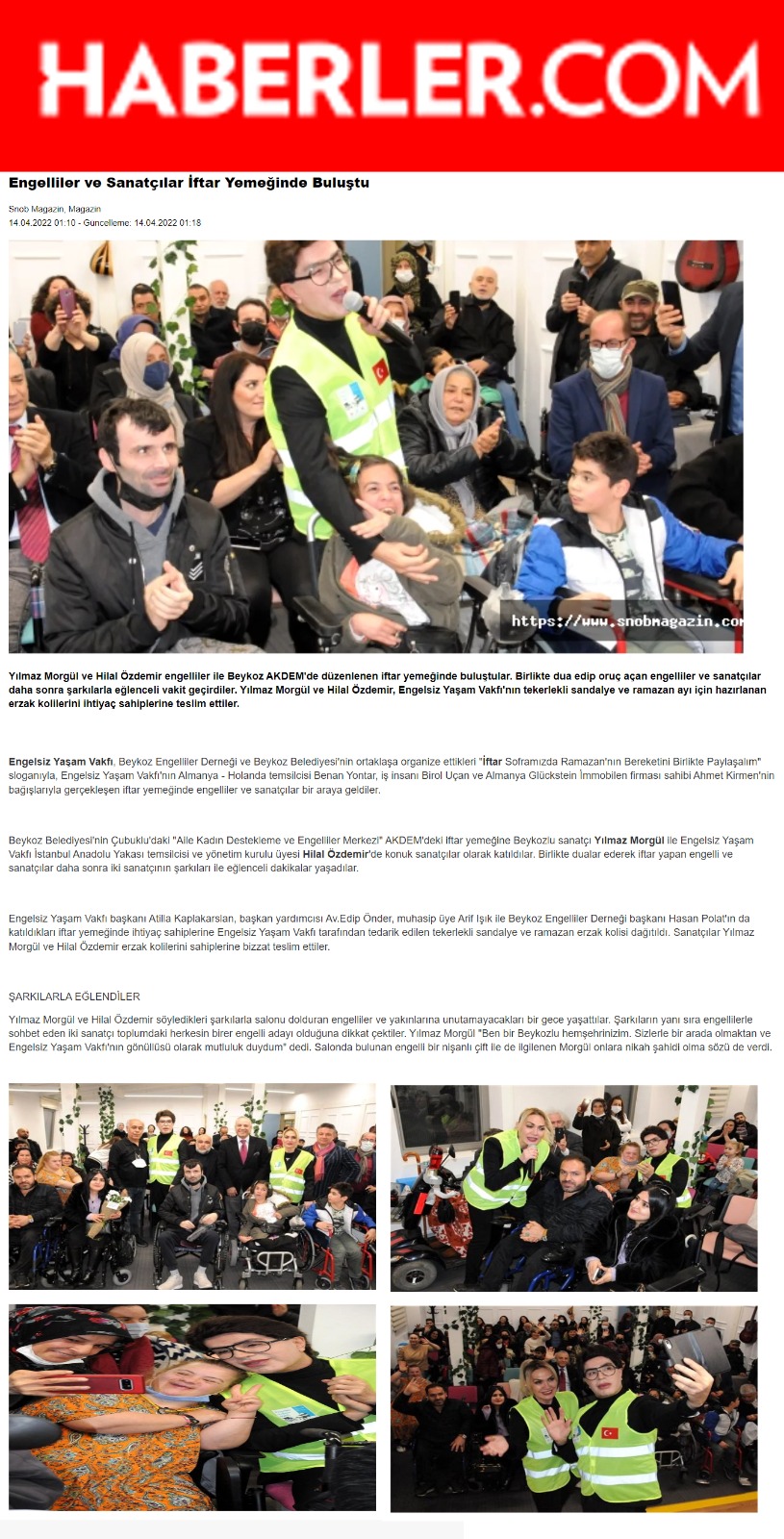 Engelsiz Yaşam Vakfı + Beykoz Belediyesi + Beykoz Engelliler Derneği işbirliği İftar Yemeği Organizasyonu yaptık