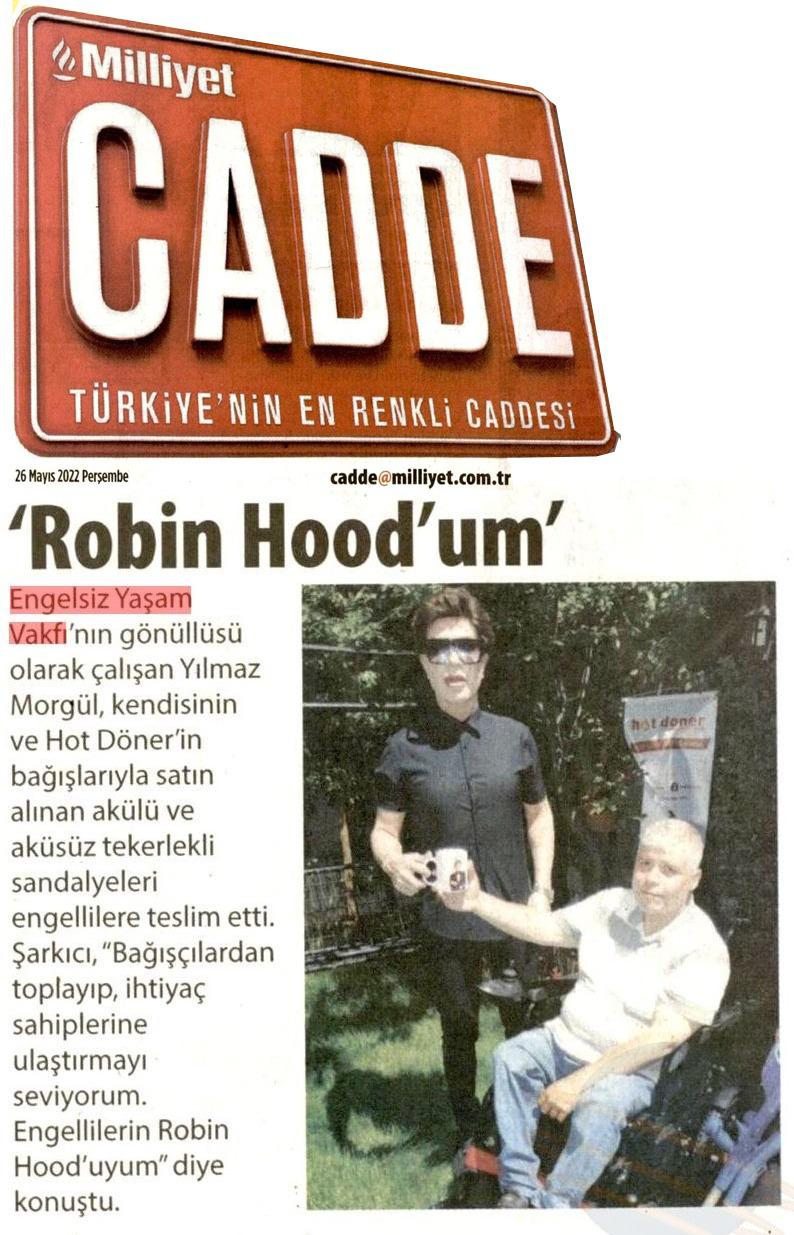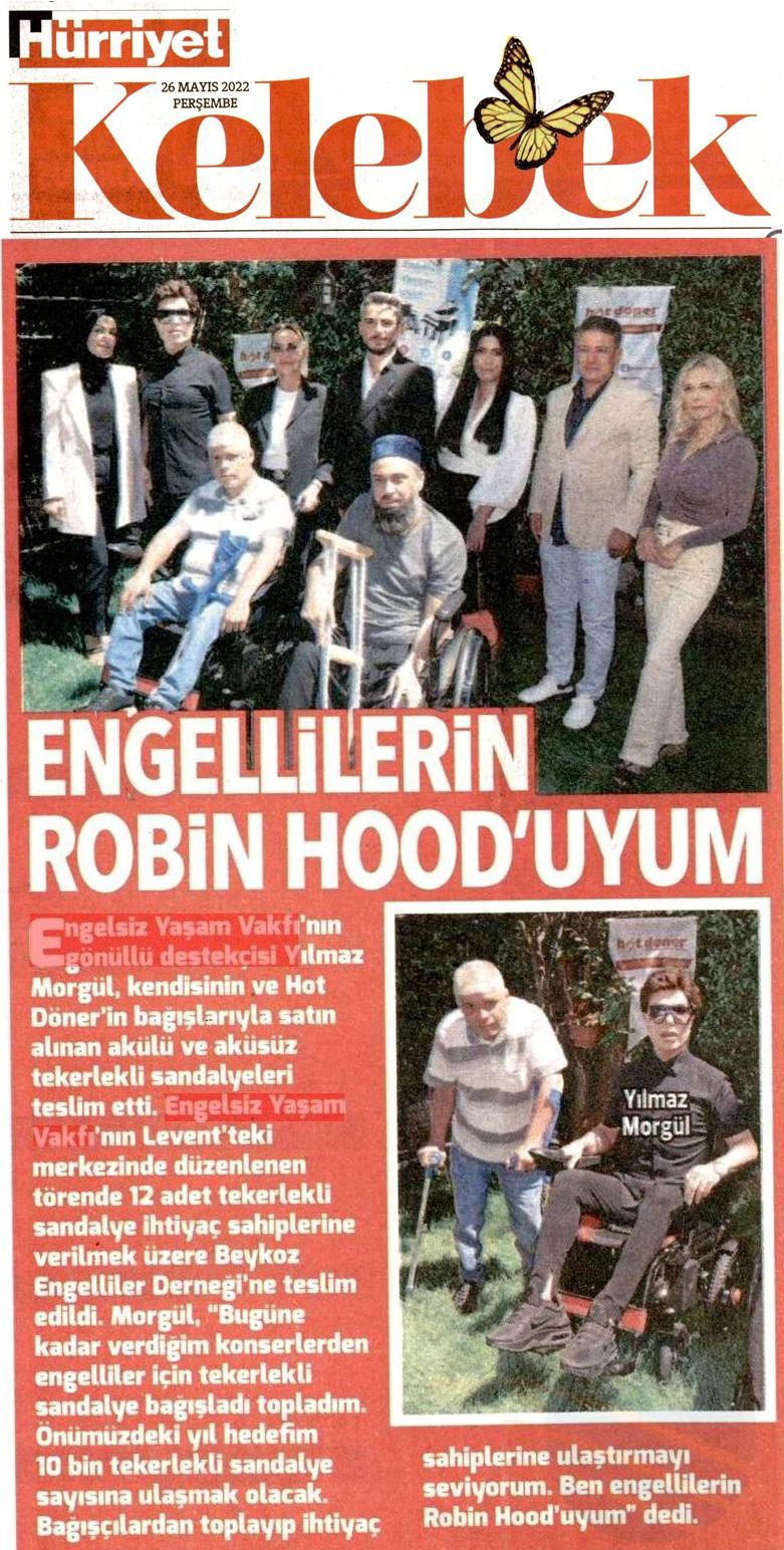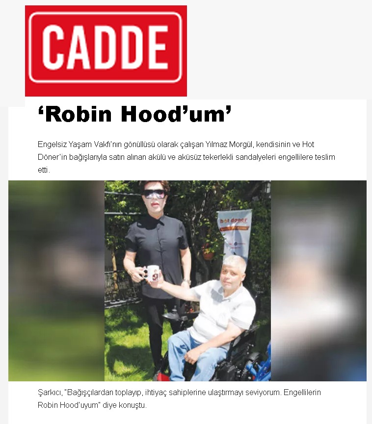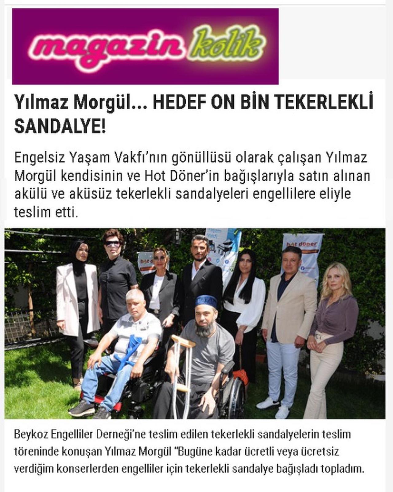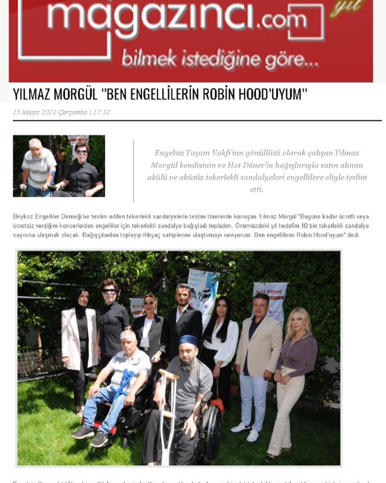 Engelsiz Yaşam Vakfı’nın gönüllüsü olarak çalışan Yılmaz Morgül kendisinin ve Hot Döner’in bağışlarıyla satın alının akülü ve aküsüz tekerlerli sandalyeleri engellilere eliyle teslim etti. Beykoz Engelliler Derneği’ne teslim edilen tekerlekli sandalyelerin teslim töreninde konuşan Yılmaz Morgül “Bugüne kadar ücretli veya ücretsiz verdiğim konserlerden engelliler için tekerlekli sandalye bağışladı topladım. Önümüzdeki yıl hedefim 10 bin tekerlekli sandalye sayısına ulaşmak olacak. Bağışçılardan toplayıp ihtiyaç sahiplerine ulaştırmayı seviyorum. Ben engellilerin Robin Hood’uyum” dedi.