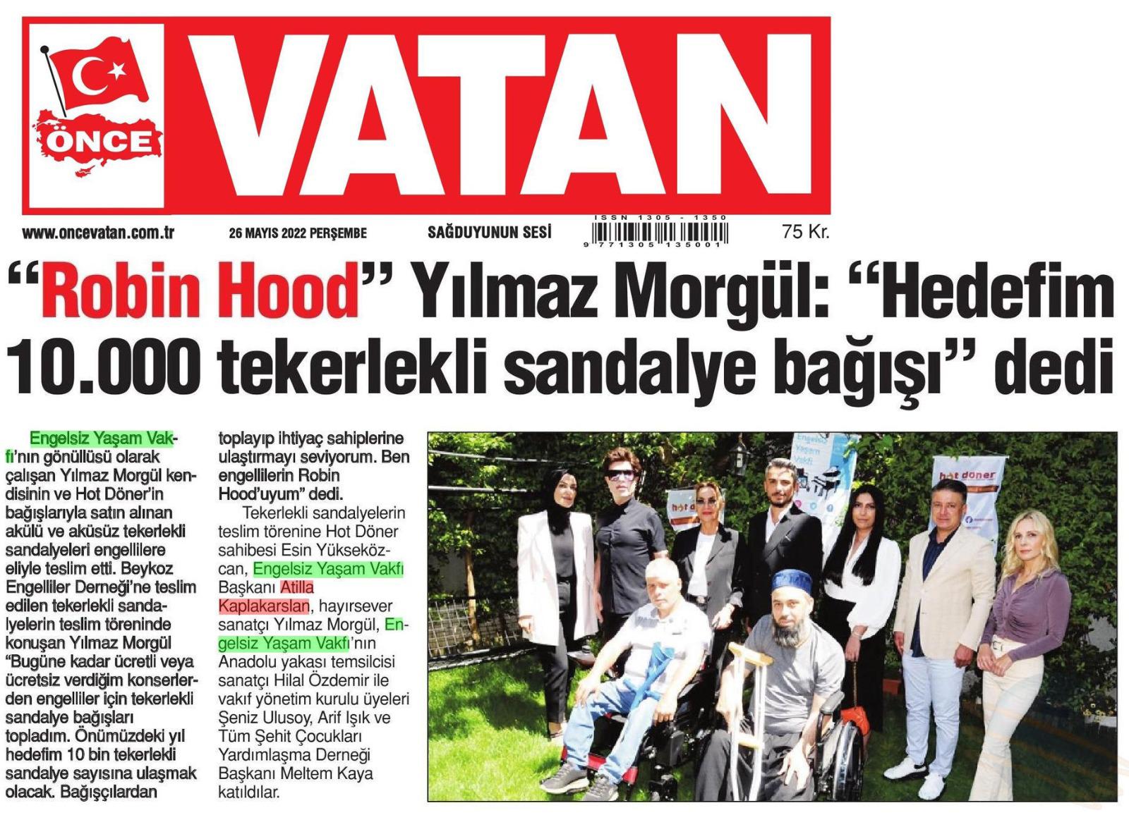 Engelsiz Yaşam Vakfı’nın Levent’deki merkezinde düzenlenen törenle toplam on iki adet tekerlekli sandalye ihtiyaç sahiplerine verilmek üzere Beykoz Engelliler Derneği’ne teslim edildi. Yılmaz Morgül’ün bir adet akülü ve beş adet manuel tekerlekli sandalyesi ile yetmiş şubesi olan Hot Döner markasının sahibesi Esin Yükseközcan’nın bağışı olan dört adet akülü ve iki adet manuel tekerlekli sandalye ihtiyaç sahibi engellilerin yüzünü güldürdü. 20 ile 65 yaş arasındaki ve yüzde elli ile yüzde doksan sekiz engeli olan kadın ve erkek kişilere teslim edilen tekerlekli sandalyeler için vakfı merkezine gelen Yılmaz Morgül, bu konuda oldukça da iddialı konuştu. Verdiği konserlerde bağışçılardan topladığı sandalyeleri ihtiyaç sahiplerine ulaştırdığını belirten sanatçı “Bugüne kadar ücretli veya ücretsiz verdiğim konserlerden engelliler için tekerlekli sandalye bağışladı topladım. Önümüzdeki yıl hedefim 10 bin tekerlekli sandalye sayısına ulaşmak olacak. Bağışçılardan toplayıp ihtiyaç sahiplerine ulaştırmayı seviyorum. Ben engellilerin Robin Hood’uyum” dedi.